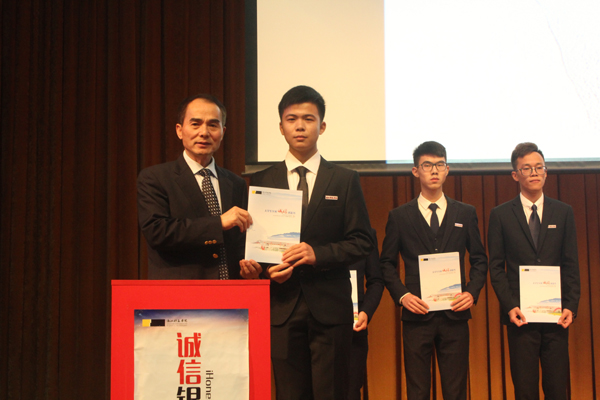 在观看完我校诚信活动回顾短片后,赵东福点亮诚信之光——启动“I honest”活动。