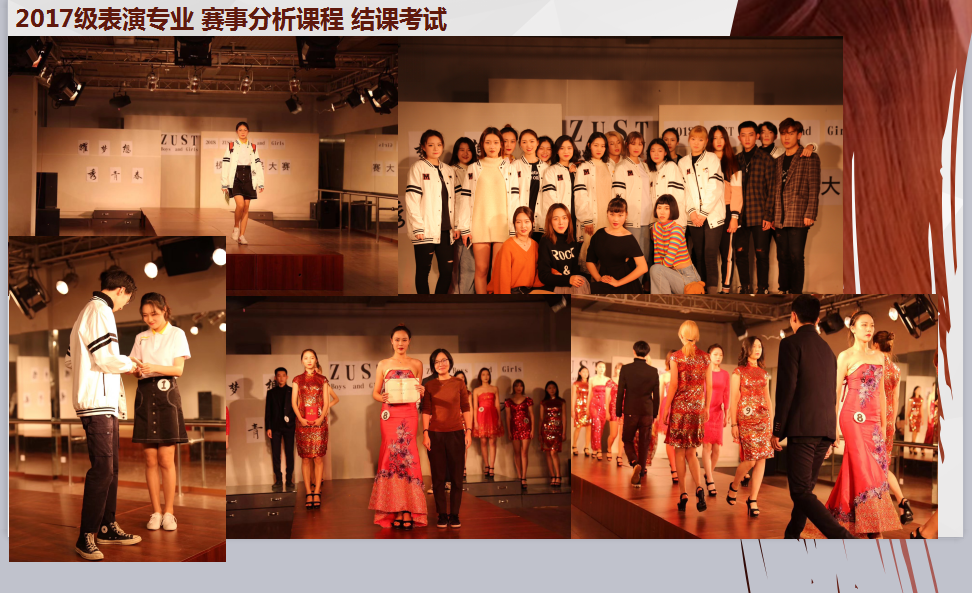 拓展模块:音乐知识、舞蹈艺术欣赏、中外服装史、编排与策划、模特经纪与管理服装品牌与流行、服装市场营销、表演剧目、主题设计与表演等。