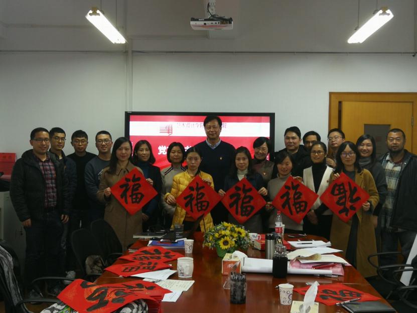 会后,党委书记、副书记送给与会人员由教工第二党支部党员孟涛老师书写的新春“福”字,同贺新春。