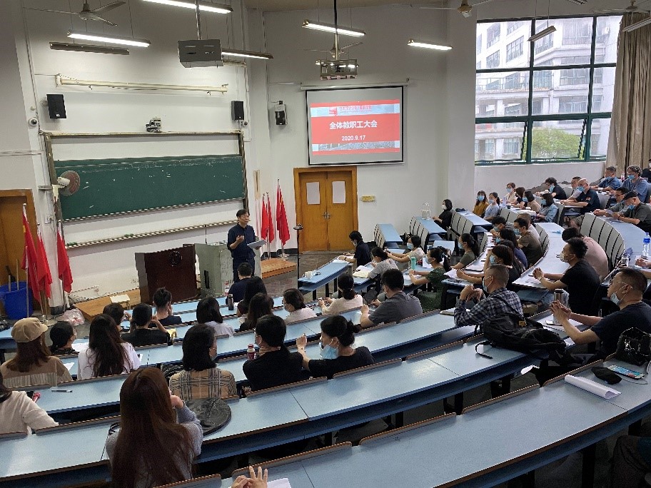 9月17日下午,学院在B3-102召开全院教职工大会,学院各条线领导对上学期及暑期工作进行了总结,对下学期重点工作作了通报及部署。会上,郑林欣院长就谋划学院“十四五规划”,深入开展慈溪研究院建设等重点工作提出了要求。詹俊书记传达了学校党委书记龚书记和赵校长在暑期干部读书会上的讲话精神,提出了三点希望:第一,进一步加强政治理论学习,认真学习习近平总书记教师节寄语、在科学家座谈会和疫情表彰大会上的讲话精神,提高思想认识,更好明确责任,全身心投入教书育人工作中。第二,牢固树立学科建设是龙头,专业建设是根本,深入推进国际化建设的办学理念。第三,紧绷疫情防控这根弦,常态化做好防疫和安全稳定工作。