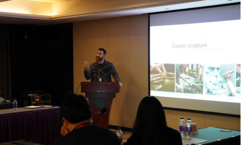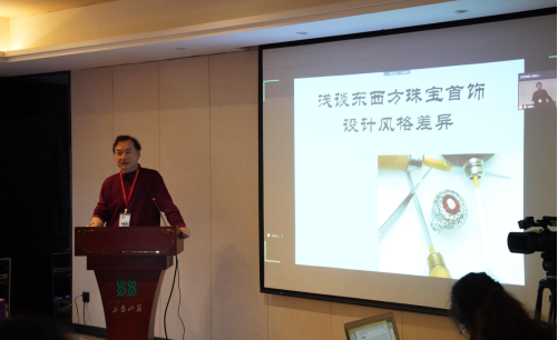 浙江科技学院教授、浙江省省级专家王春刚以《浅谈东西方珠宝首饰设计风格差异》为题,分析了中国和美国的珠宝首饰设计的区别。中国的珠宝首饰设计经过了20余年的发展,突破了过去只注重传统纹样的方式,寻找到了一条具有东方文化、美学与时尚融合的设计风格。他结合一些具体的设计案例,指出了不同国家的设计是有差异的,中国的珠宝首饰设计要学习西方先进的设计理念与方法的同时,更要注重东方文化特色且追求高端性与创新性。他通过介绍G20峰会胸针设计,指出了在设计中融入文化元素、展现特色文化、实现民族情感认同的路径。
