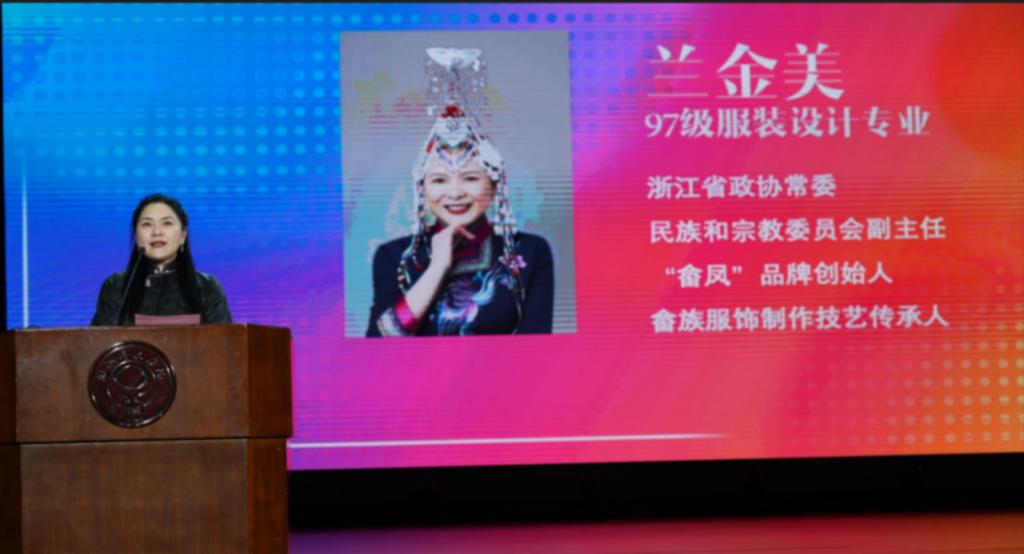 党委书记詹俊、副院长宋眉发表致辞,宣布正式启动本届毕业设计展及艺术文化节。优秀校友代表97级服装设计校友,畲族服饰制作技艺传承人、“畲凤”品牌创始人、浙江省政协常委、民族和宗教委员会副主任兰金美女士和90级服装设计校友杭州洁印环境科技有限公司总经理杜晓帆先生先后发表致辞,以诚挚、热情、感人的发言激励学子们再接再厉,在设计舞台上书写青春光彩,引发学生们的共鸣和阵阵掌声。启动仪式之后,举行了校友联络人聘请仪式,坚持我的服饰(杭州)股份有限公司设计中心总监陈修武先生、杭州载物服装设计有限公司总经理韩红红女士、杭州楠方绘文化发展有限公司总经理黄勇先生三位校友代表为联络人颁发聘请证书。学院还邀请了优秀本科毕业生代表及研究生代表发言,优秀的榜样激励学子们挑战未来,不断超越自我。
