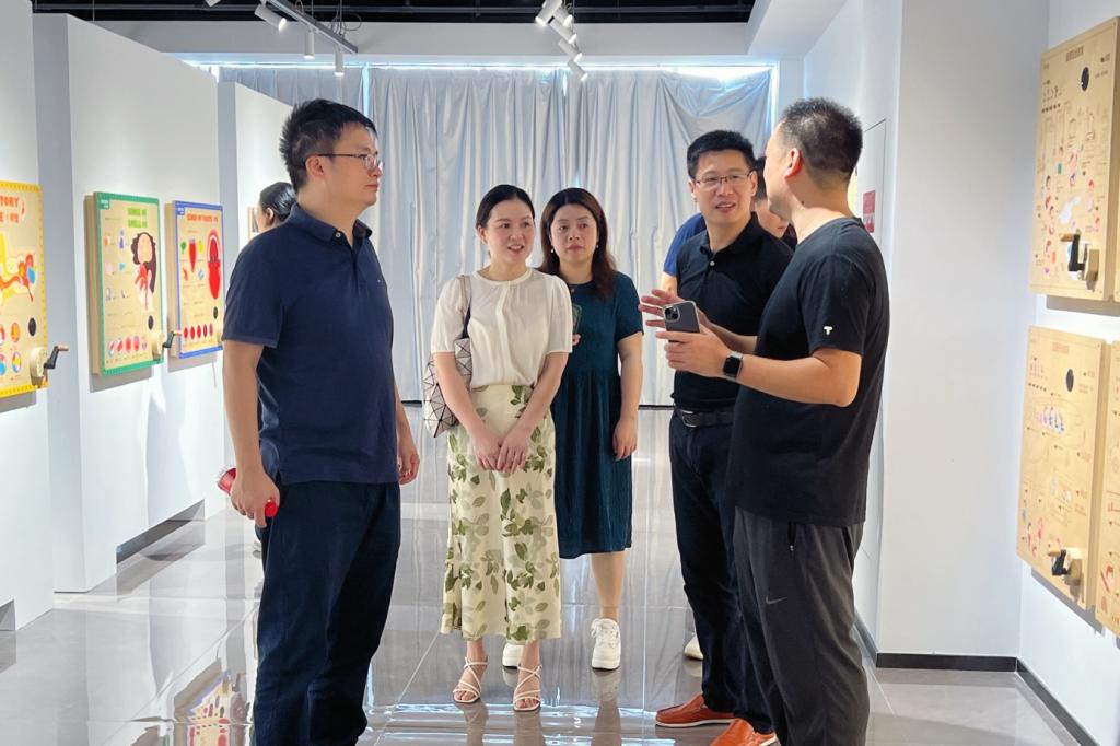 浙江童园玩具有限公司总经理卓理为团队介绍童园玩具展厅的科技墙面玩具
