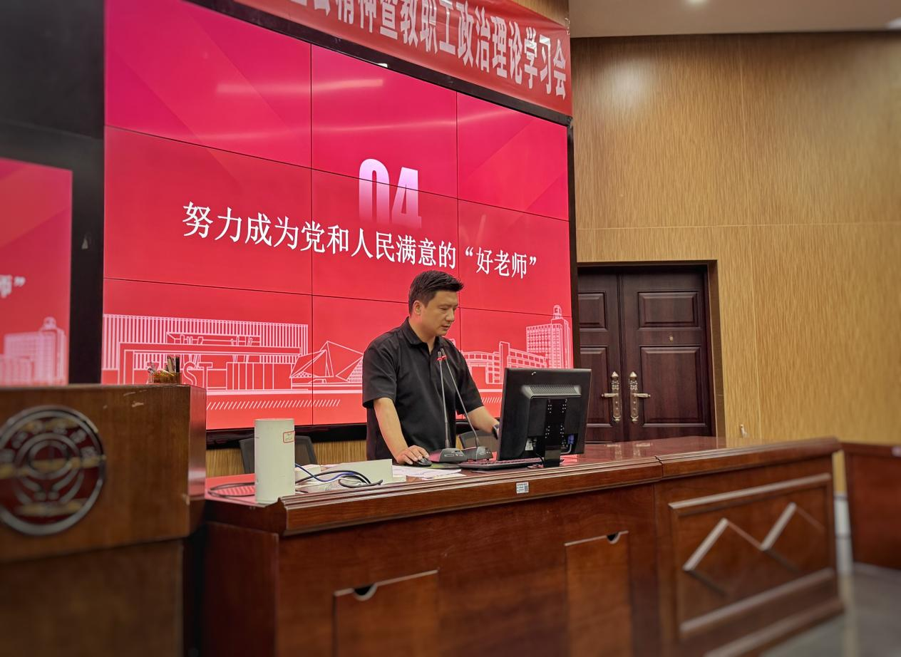 蒋邢飞书记从何谓“师德师风”入手,结合近年来教育部公开曝光的高校教师失德失范典型案例,深入剖析了违反政治纪律、教育教学违规、生活作风问题、侵害学生权益及学术不端等几类突出问题。通过一个个鲜活的警示案例,为全体教职工敲响了思想警钟。在专题宣讲中,蒋书记带领全体教职工系统重温了《新时代高校教师职业行为十项准则》,同时结合学校最新出台的师德师风建设实施细则,重点强调了课堂教学、师生交往、学术研究等关键环节的规范要求。“师德是教师的立身之本,师风是教育的生命之魂。”他希望全体教职工要自觉践行教育家精神,以德立身、以德立学、以德施教,共同营造风清气正的育人环境。